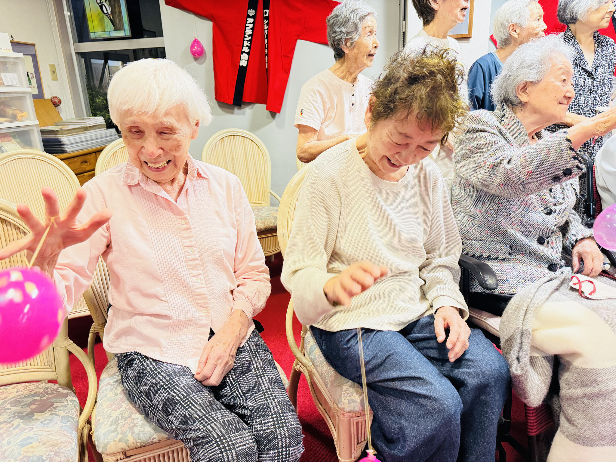 8月10日に夏の恒例行事「盆踊り大会」を開催しました。東京音頭や炭坑節に合わせ、ひと月練習を重ねた皆さまは輪になり踊り、その周りに座った観客役の皆さまも手拍子で参加。フェスタでもお馴染みの星先生の迫力ある和太鼓の響きと相まり迫力満点、普段お部屋で過ごされている方もその音につられて会場のロビーへ、一層の盛り上がりを見せました。浴衣姿や真っ赤な法被を羽織ったスタッフから手作りヨーヨーをお渡しすると、「懐かしい」と喜びの声が広がりました。尽力したスタッフの熱意が形となり、心弾む楽しい夏のひとときとなりました。