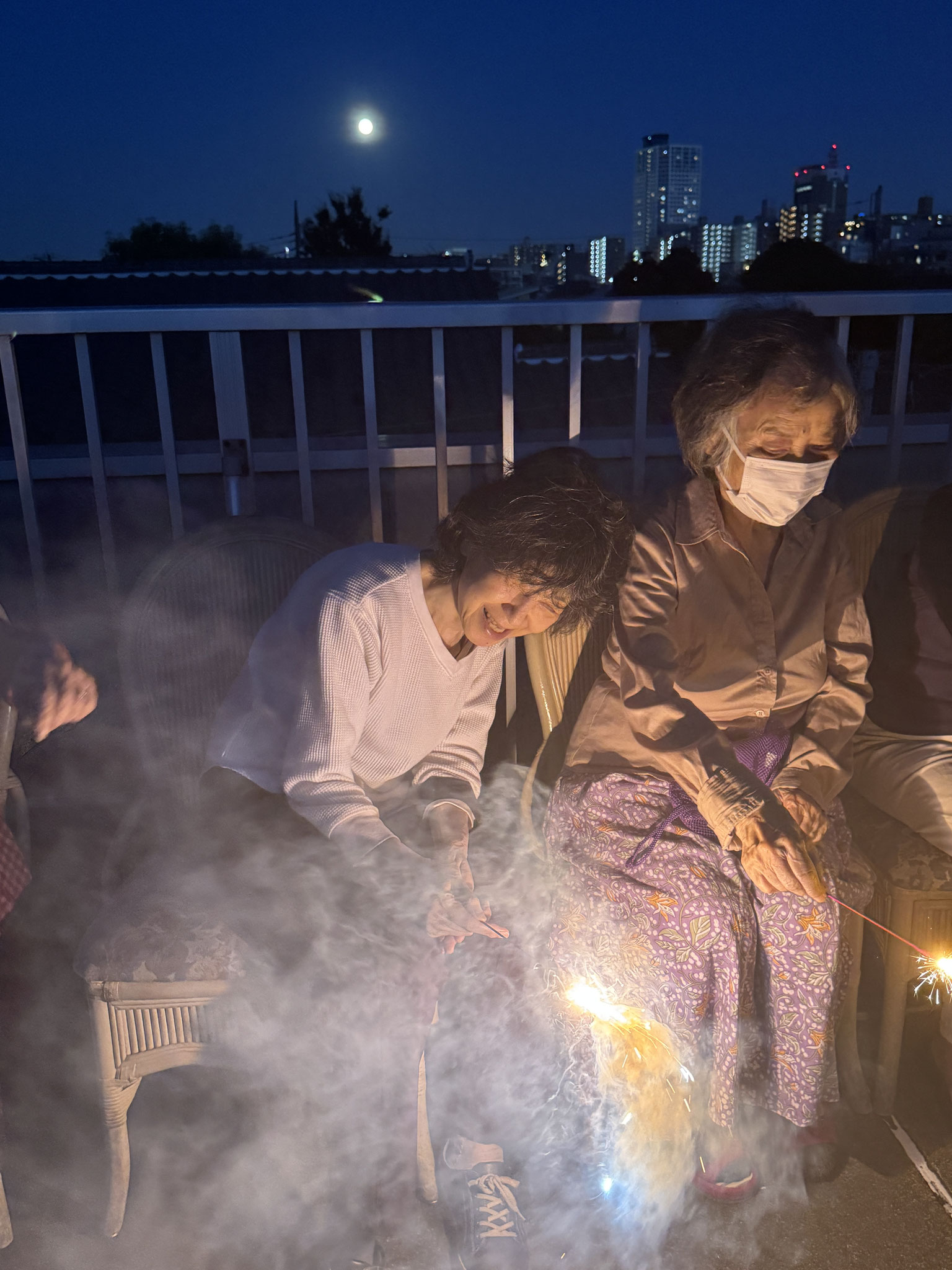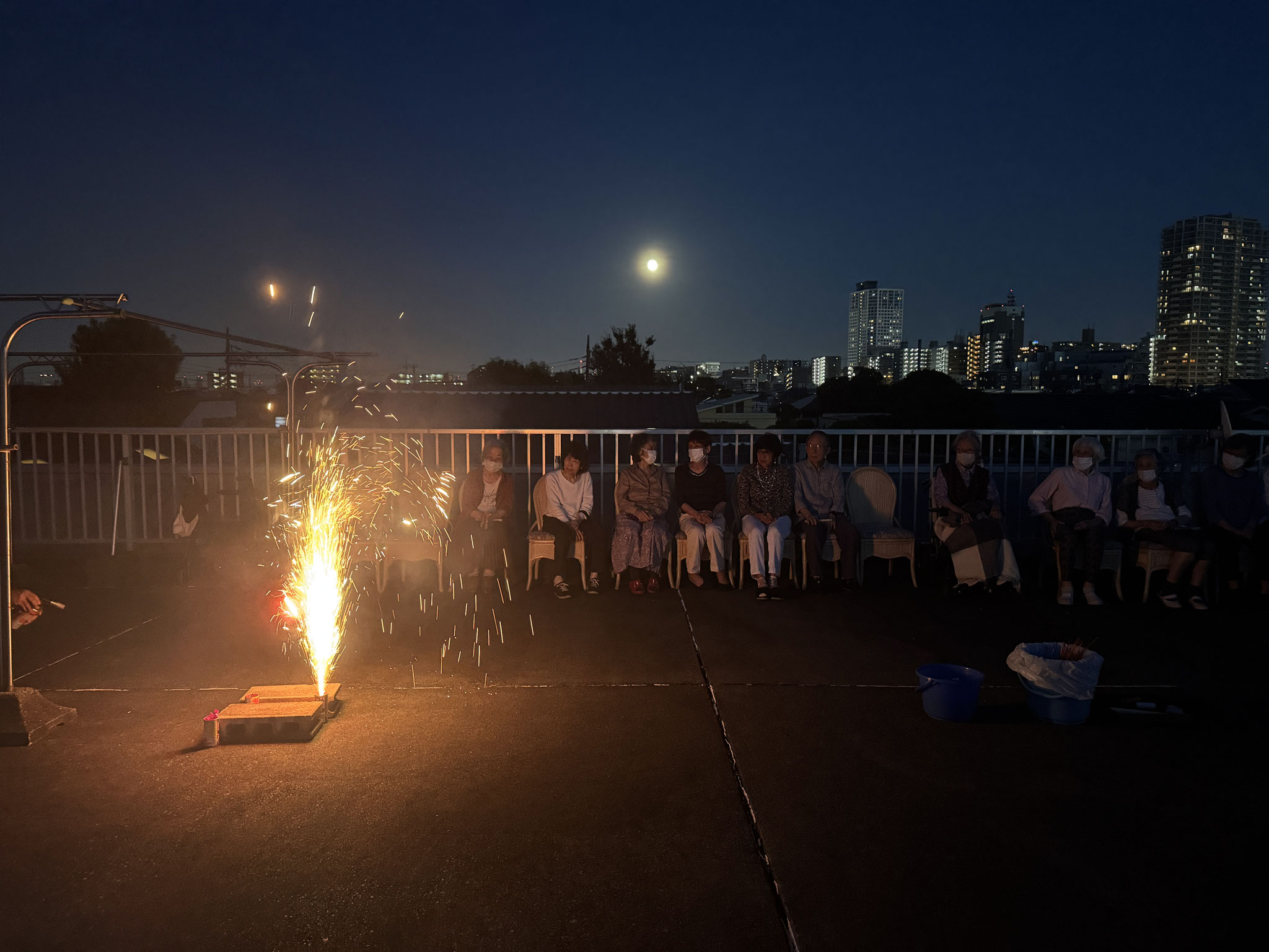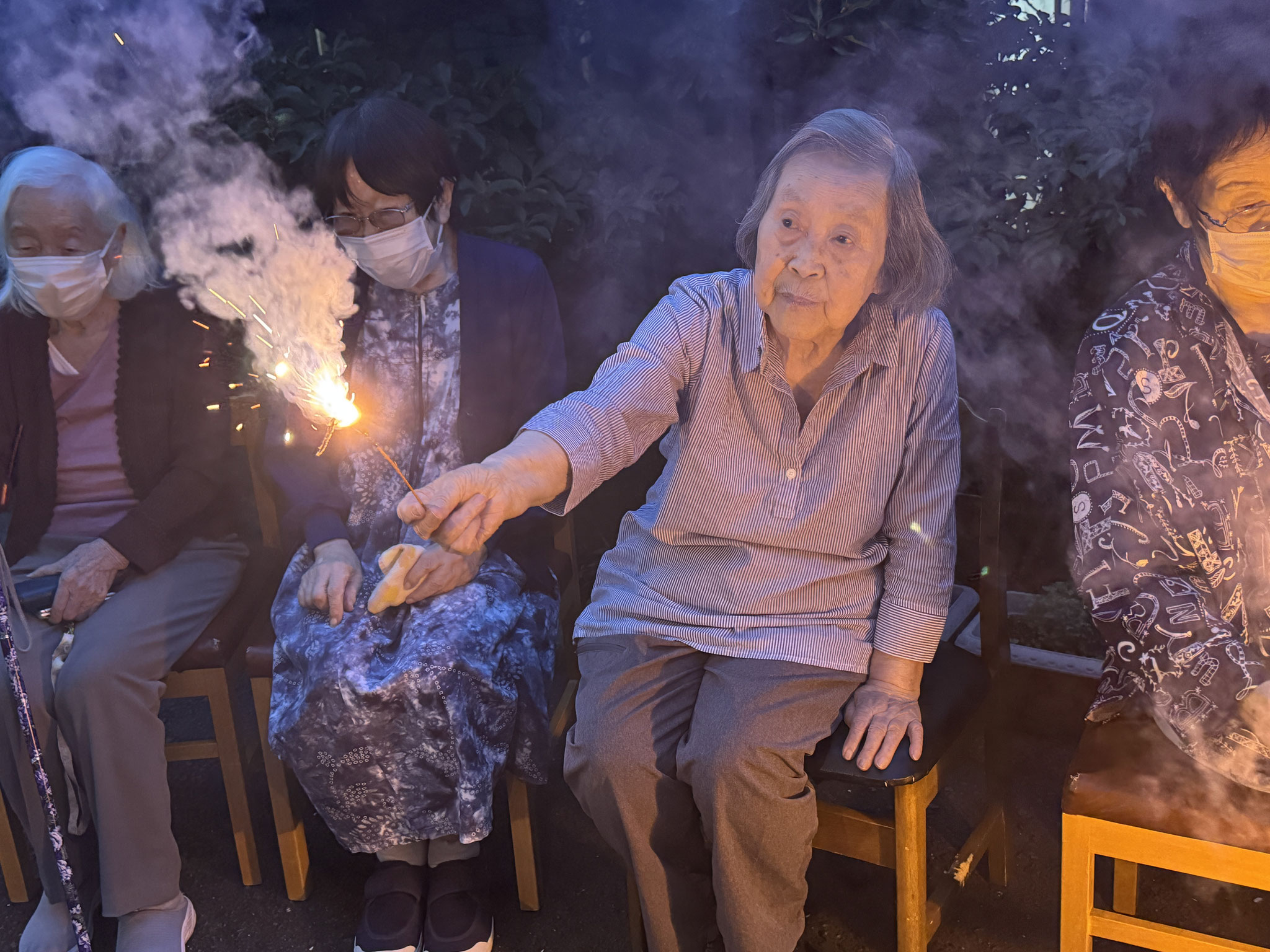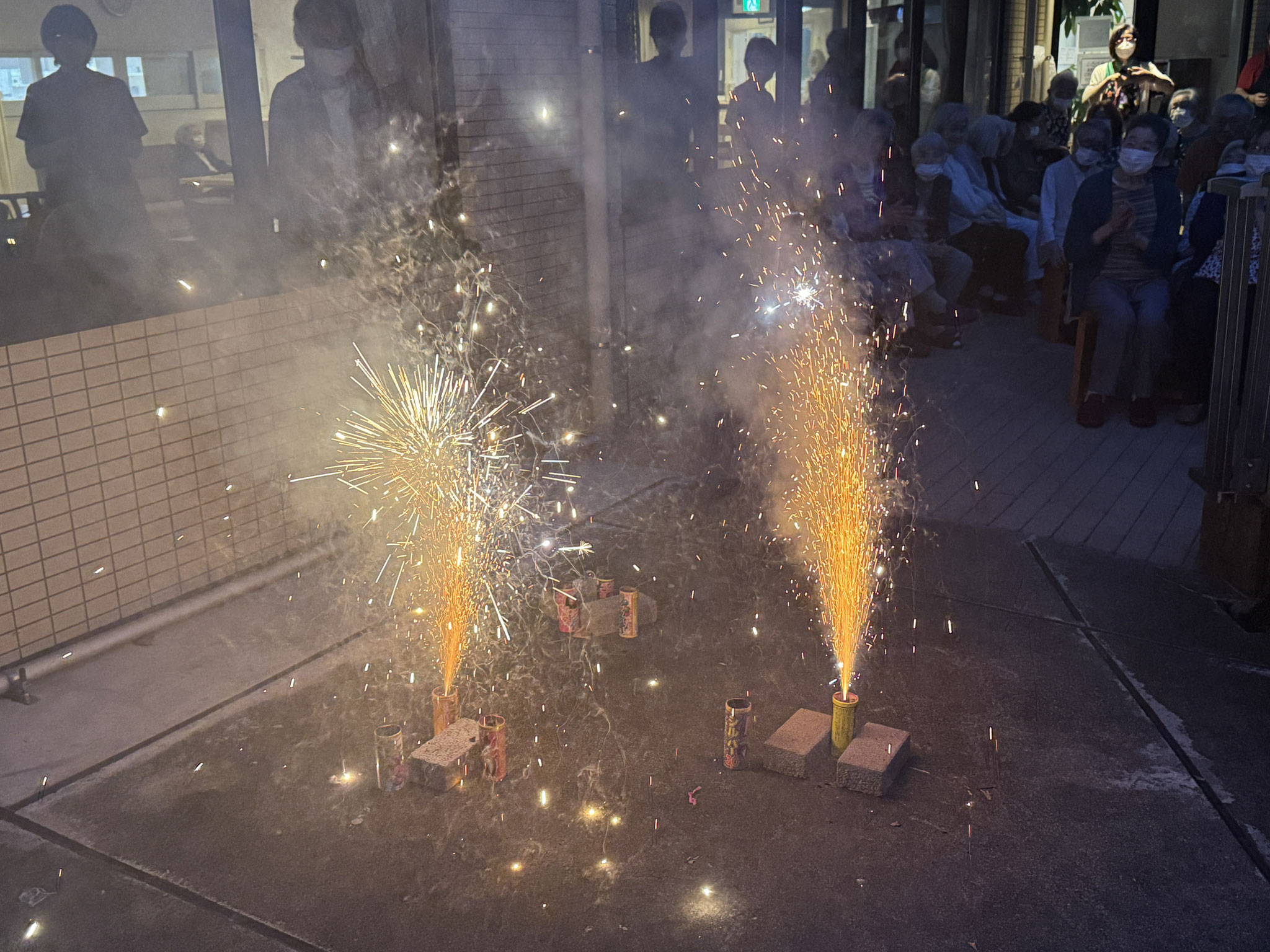 今年も各館で花火大会を開催しました。今回はなんと昨年よりスケールアップし、合計370本の花火を用意!打ち上げ花火や噴射、手持ち花火など様々な種類を楽しんでいただきました。夜空にきれいな光が広がるたびに歓声が上がり、皆さんの笑顔がたくさん見られました。外出が難しい季節でも、館内で夏を感じられる素敵な時間となりました。