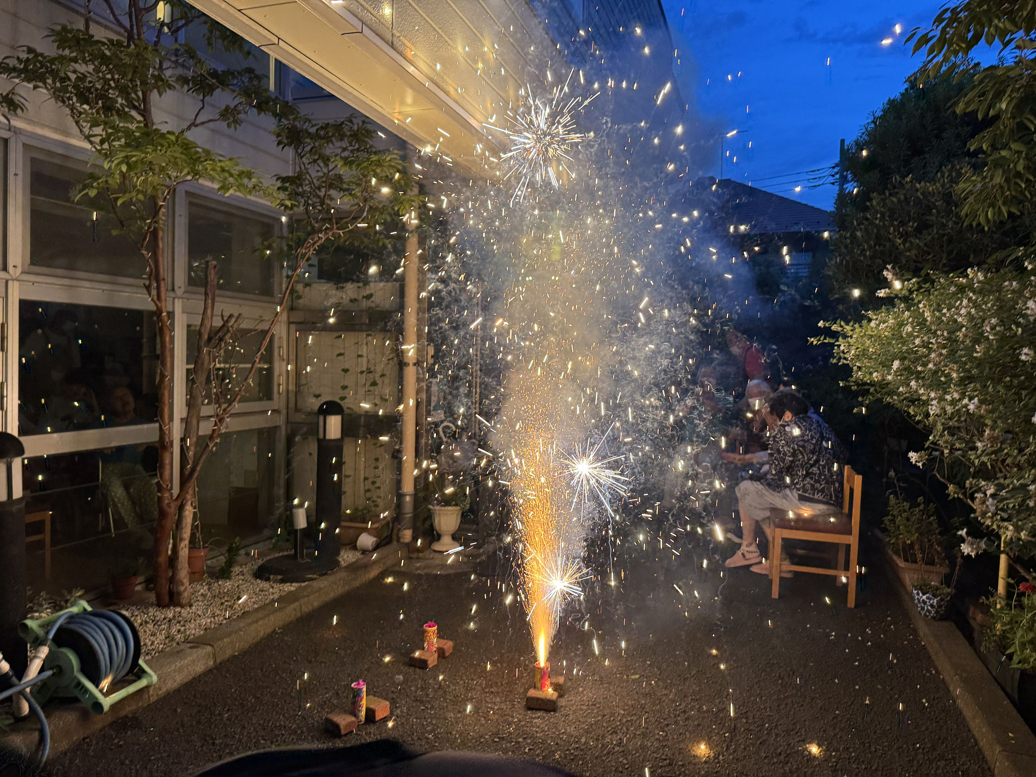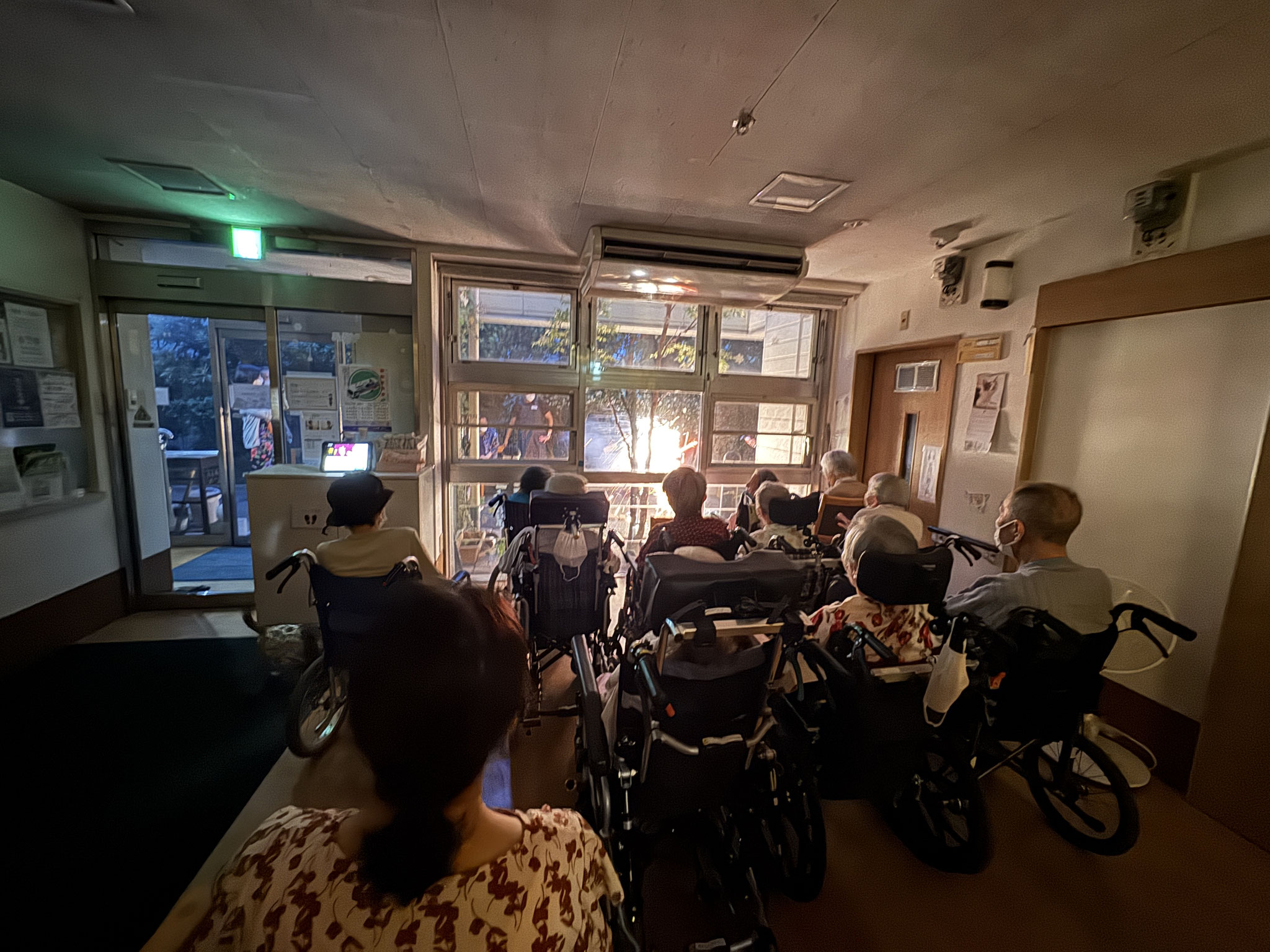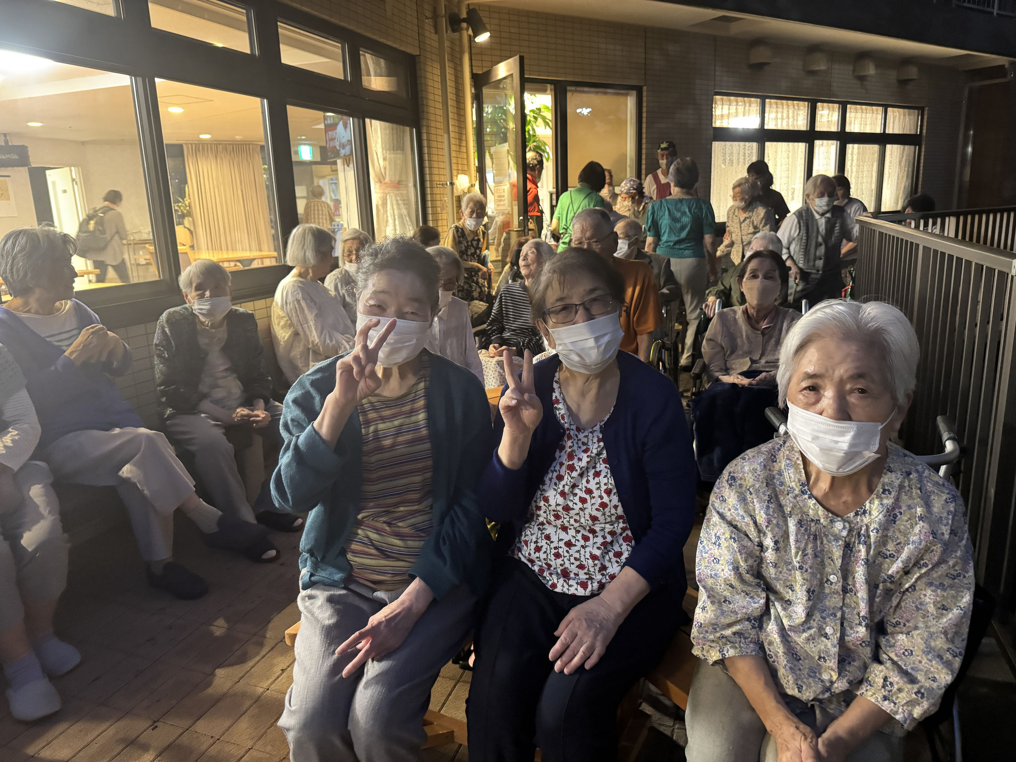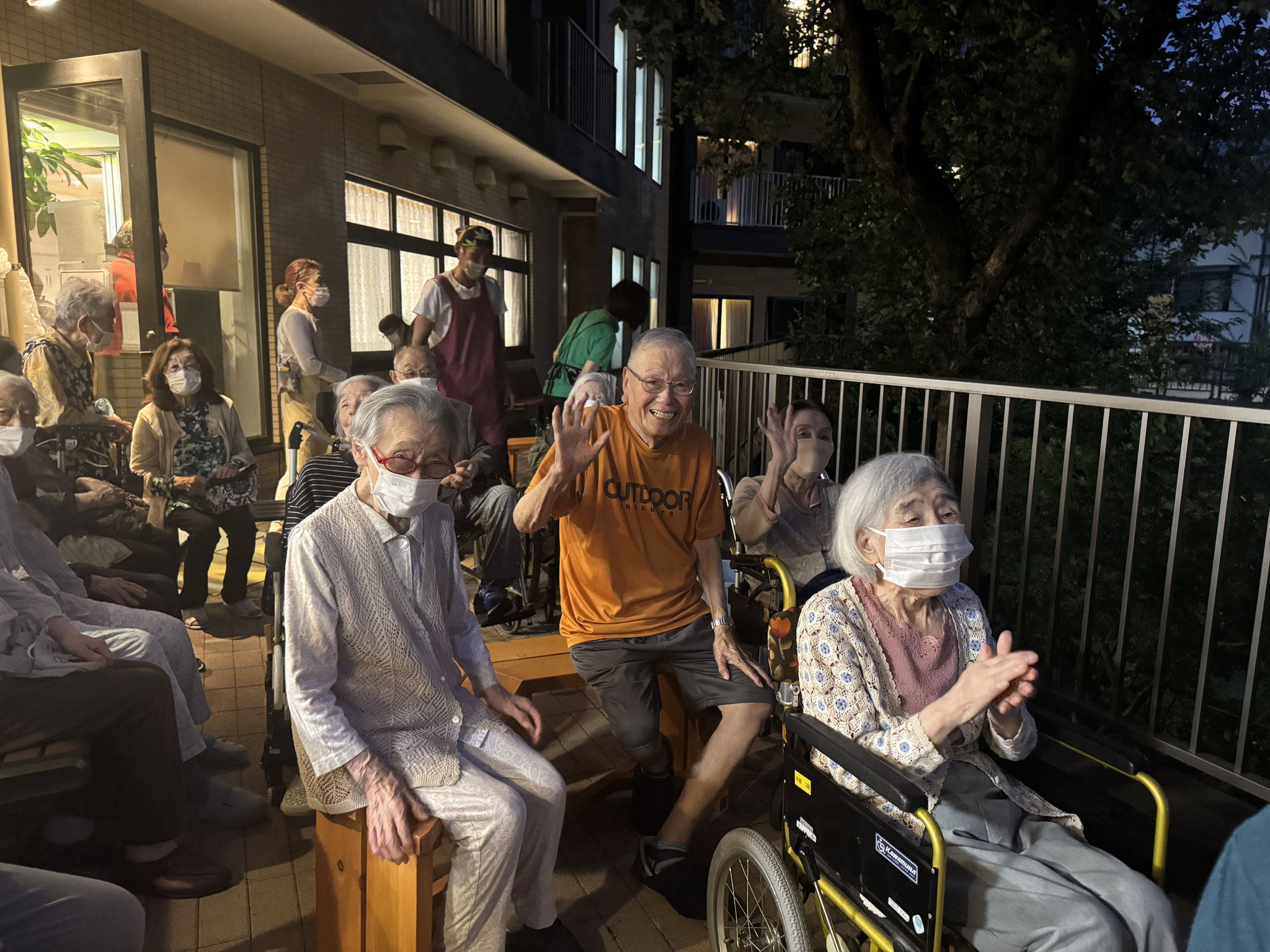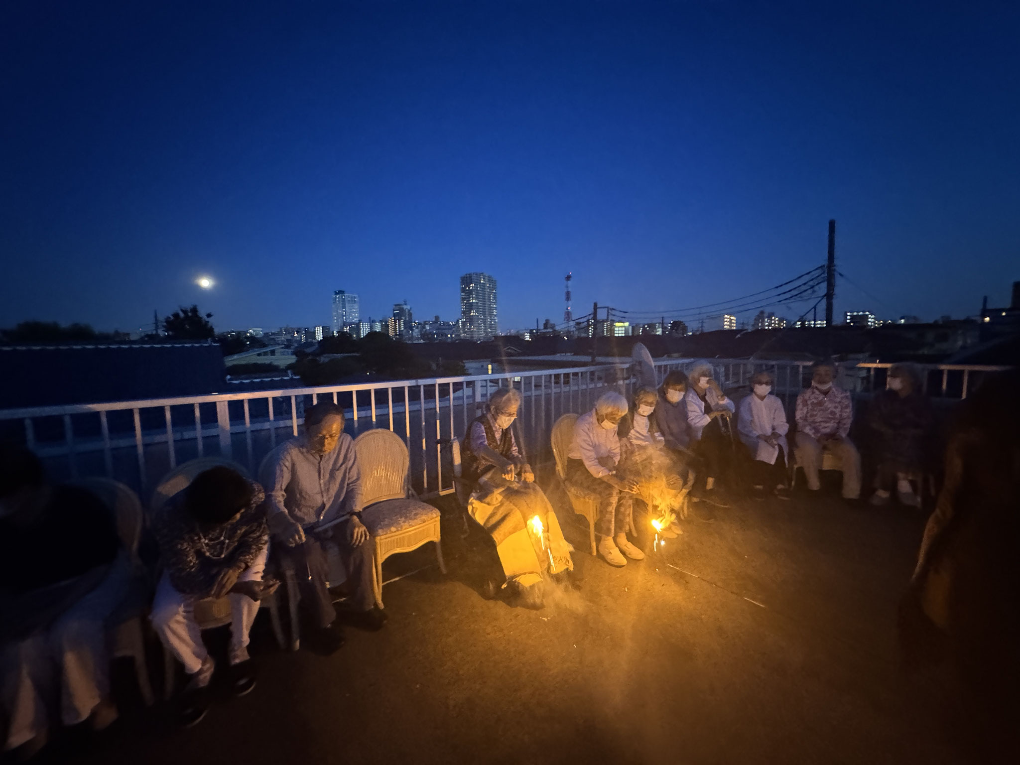 今年も各館で花火大会を開催しました。今回はなんと昨年よりスケールアップし、合計370本の花火を用意!打ち上げ花火や噴射、手持ち花火など様々な種類を楽しんでいただきました。夜空にきれいな光が広がるたびに歓声が上がり、皆さんの笑顔がたくさん見られました。外出が難しい季節でも、館内で夏を感じられる素敵な時間となりました。