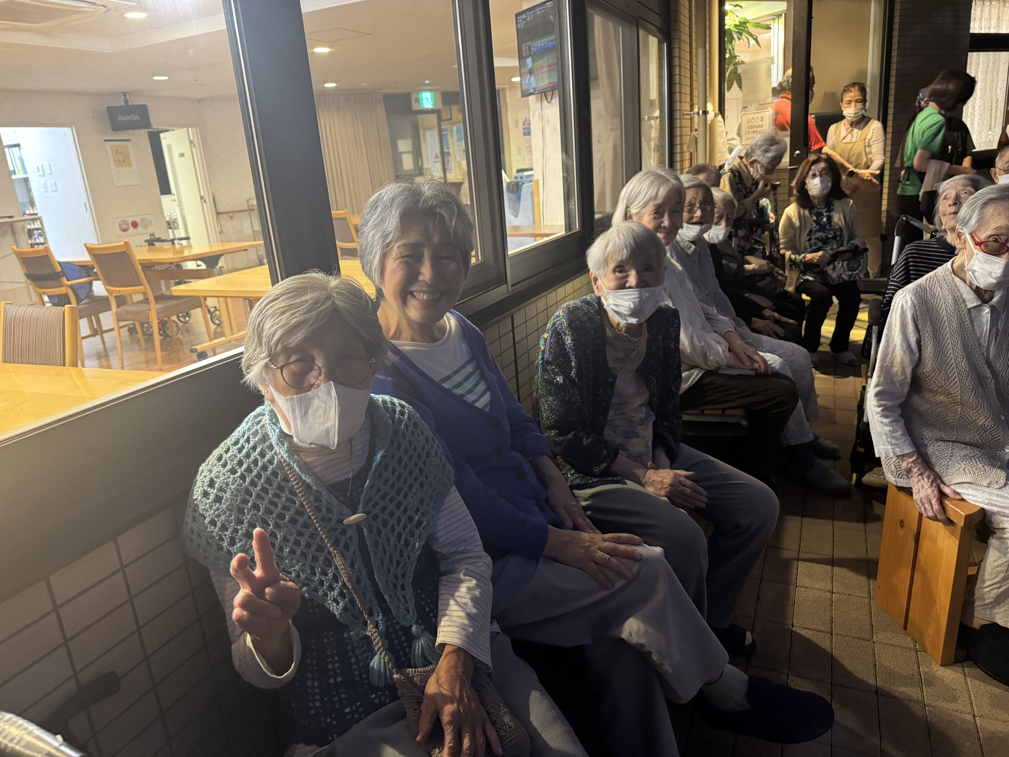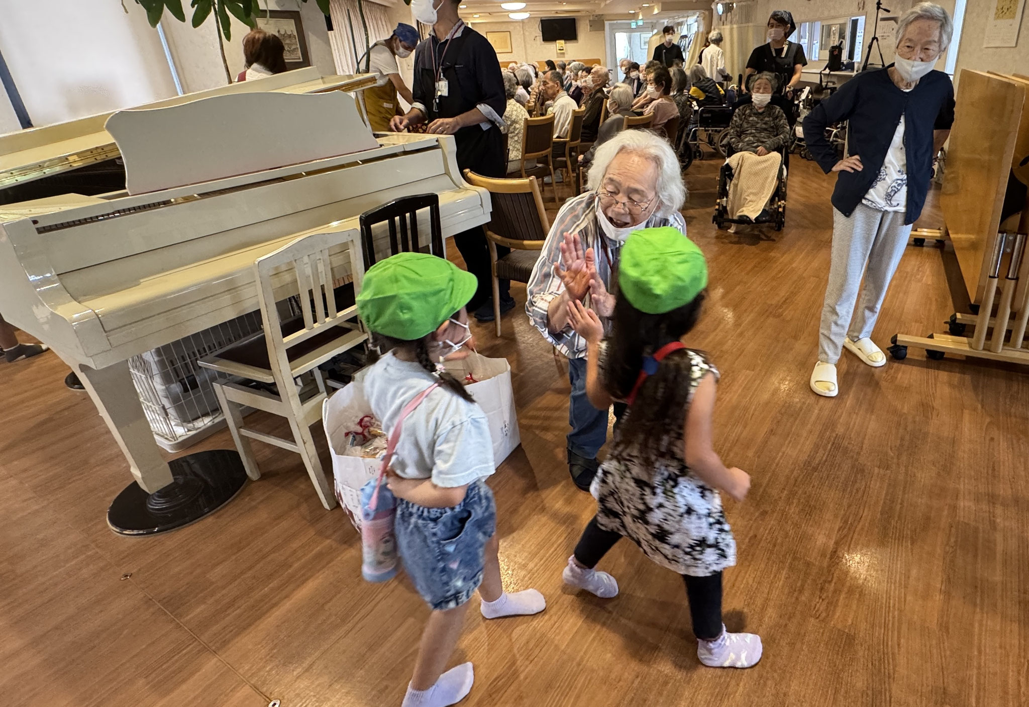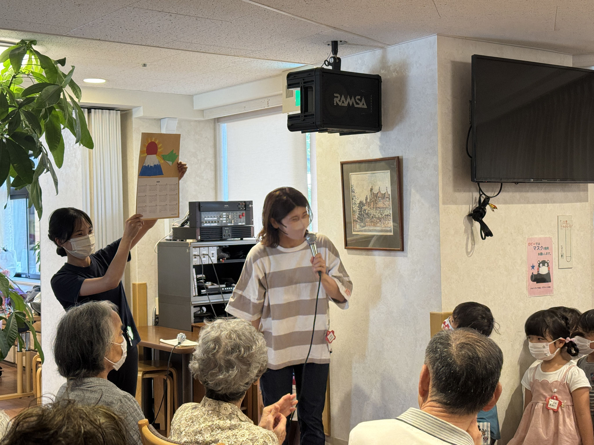 9月18日、向南幼稚園の年中さん約70名が当ホームに来てくださり、敬老の日をお祝いする歌とプレゼントを届けてくれました。 子どもたちは「とんぼのめがね」「大きな栗の木の下で」「ホ・ホ・ホ」の3曲を、可愛らしく元気いっぱいに披露。会場は自然と笑顔と拍手に包まれました。さらに、和紙で作った富士山に絵の具や折り紙で彩った、心のこもった手作りカレンダーの贈り物もいただき、お客様も大喜び。 実は来てくれた子どもたちの半数以上が、この夏ホームのプールに遊びに来てくれた子たち。夏に続く再会に、お客様からも「また来てくれたのね」と嬉しい声が聞かれました。最後には、お客様から子どもたちへお礼の気持ちを込めたお菓子のプレゼントも。笑顔でハイタッチして帰る姿がとても印象的でした。