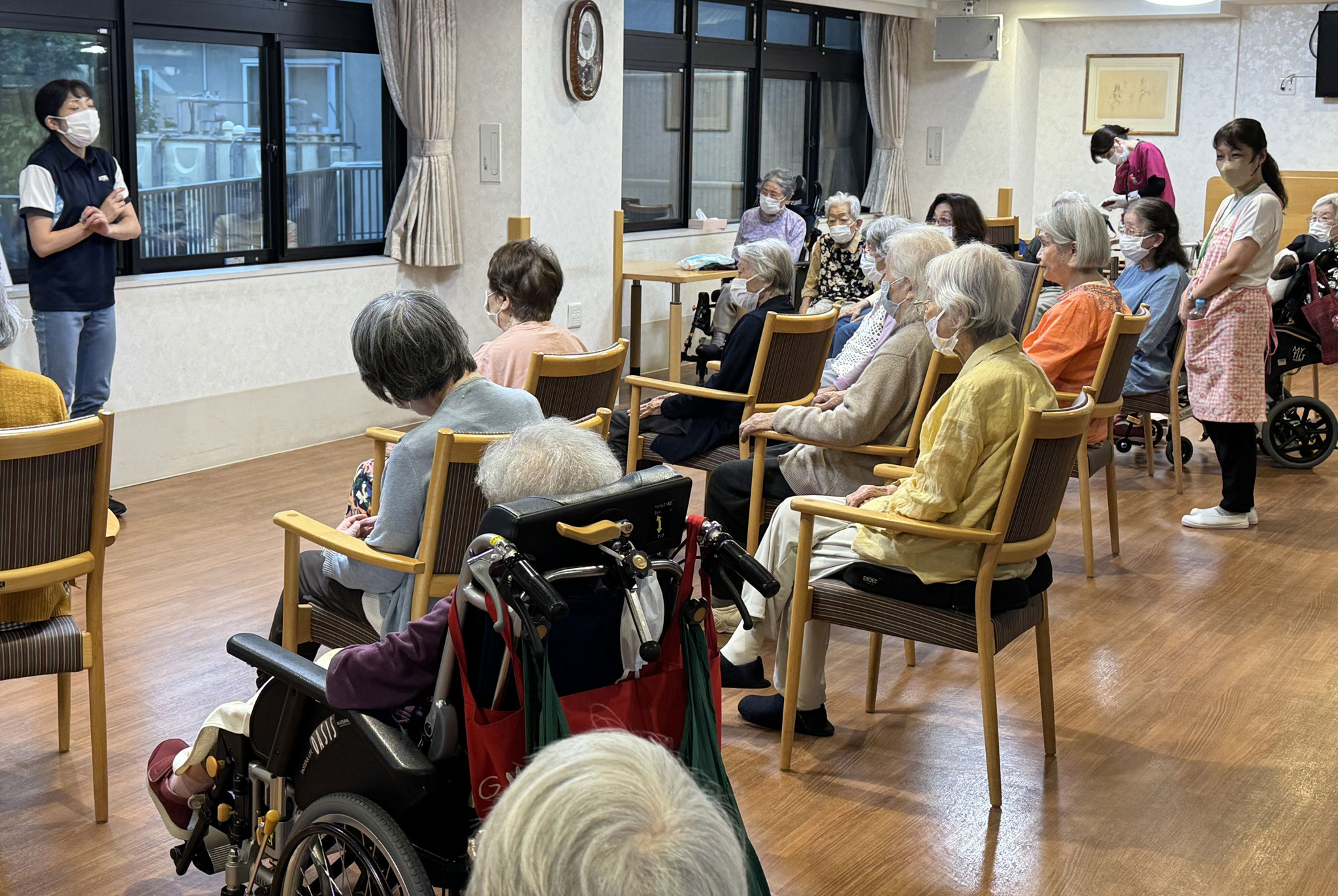 9月18日、向南幼稚園の年中さん約70名が当ホームに来てくださり、敬老の日をお祝いする歌とプレゼントを届けてくれました。 子どもたちは「とんぼのめがね」「大きな栗の木の下で」「ホ・ホ・ホ」の3曲を、可愛らしく元気いっぱいに披露。会場は自然と笑顔と拍手に包まれました。さらに、和紙で作った富士山に絵の具や折り紙で彩った、心のこもった手作りカレンダーの贈り物もいただき、お客様も大喜び。 実は来てくれた子どもたちの半数以上が、この夏ホームのプールに遊びに来てくれた子たち。夏に続く再会に、お客様からも「また来てくれたのね」と嬉しい声が聞かれました。最後には、お客様から子どもたちへお礼の気持ちを込めたお菓子のプレゼントも。笑顔でハイタッチして帰る姿がとても印象的でした。