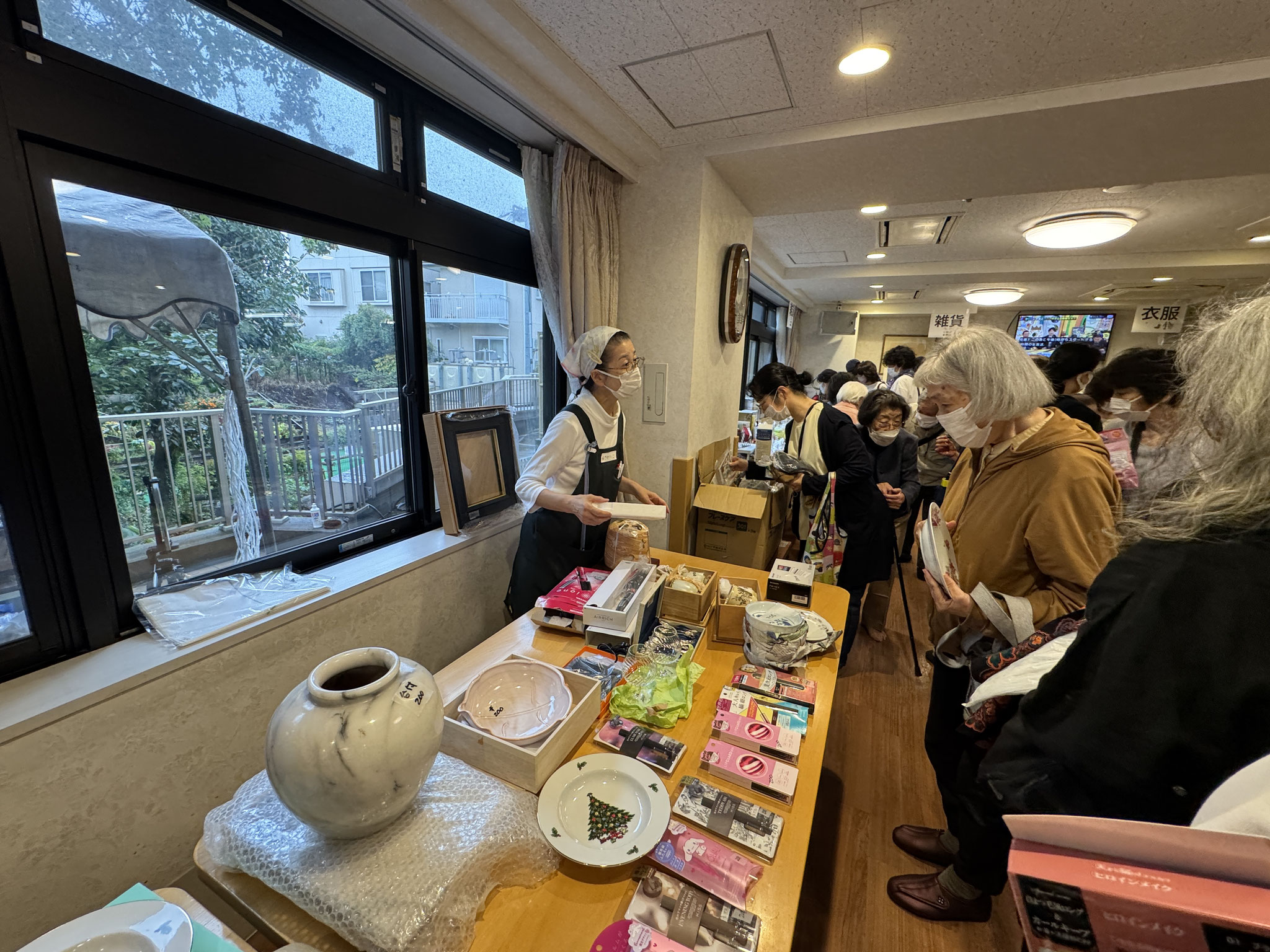 10月11日(土)、毎年恒例のバザーを開催いたしました。あいにくの雨にもかかわらず、地域の皆様やご家族の方々も多数ご来場いただき、会場は大賑わい。普段はお部屋で過ごされる方が夢中で商品を選ばれたり、「買いすぎちゃった!」と笑顔の方あり。とにかく良いものが安い!100円ショップも脱帽の値段です。焼きそば・焼き鶏も大好評で完売!皆様大喜びのひと時となりました。